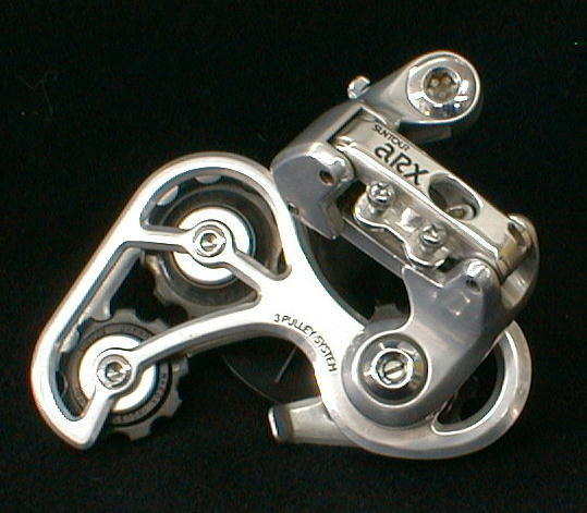 サンツアー aRx 1986頃のMTB用 ローギヤとトップギヤーの歯数の差が 大きい為、生まれたリヤーディレーラー 3個のプーリーを持つ その名も トライプーリー |