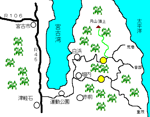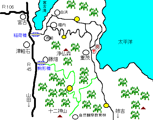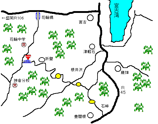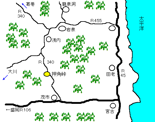 宮古からR106を行き花輪橋より農免道に入る、橋より4qぐらいで、